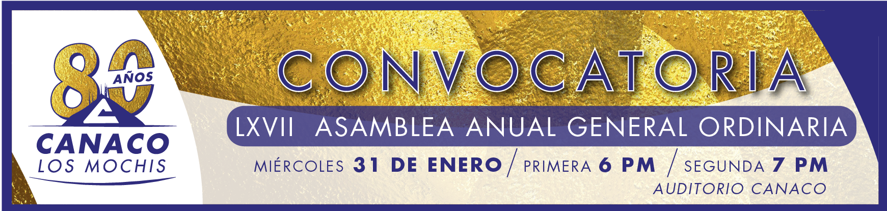 De conformidad con los artículos 20 y 21 de la Ley de Cámaras Empresariales y sus Confederaciones, así como con los artículos 15, 16, 17, 18, 19 y 20 de los Estatutos que nos rigen, se convoca a los Socios a la LXVII Asamblea Anual General Ordinaria, que se realizara a las 18:00 horas en primera Convocatoria y a las 19:00 horas en segunda Convocatoria, el próximo Miércoles 31 de Enero de 2018, en el Auditorio de este Organismo, ubicado en Guillermo Prieto y Cuauhtémoc, misma que se celebrará de acuerdo con lo siguiente: