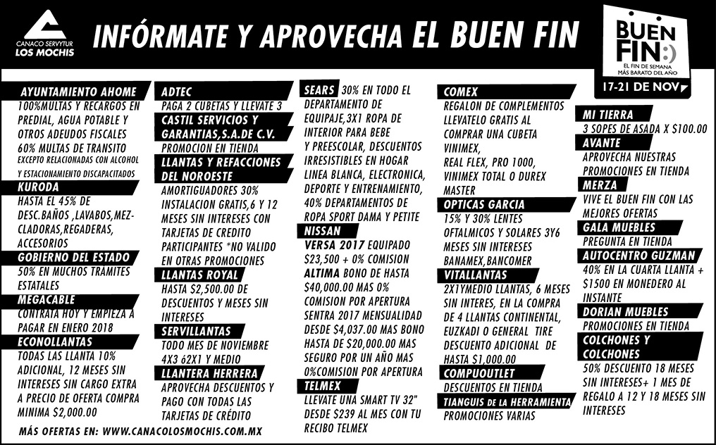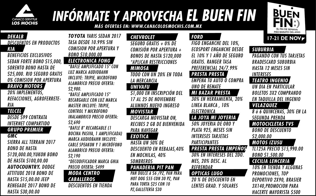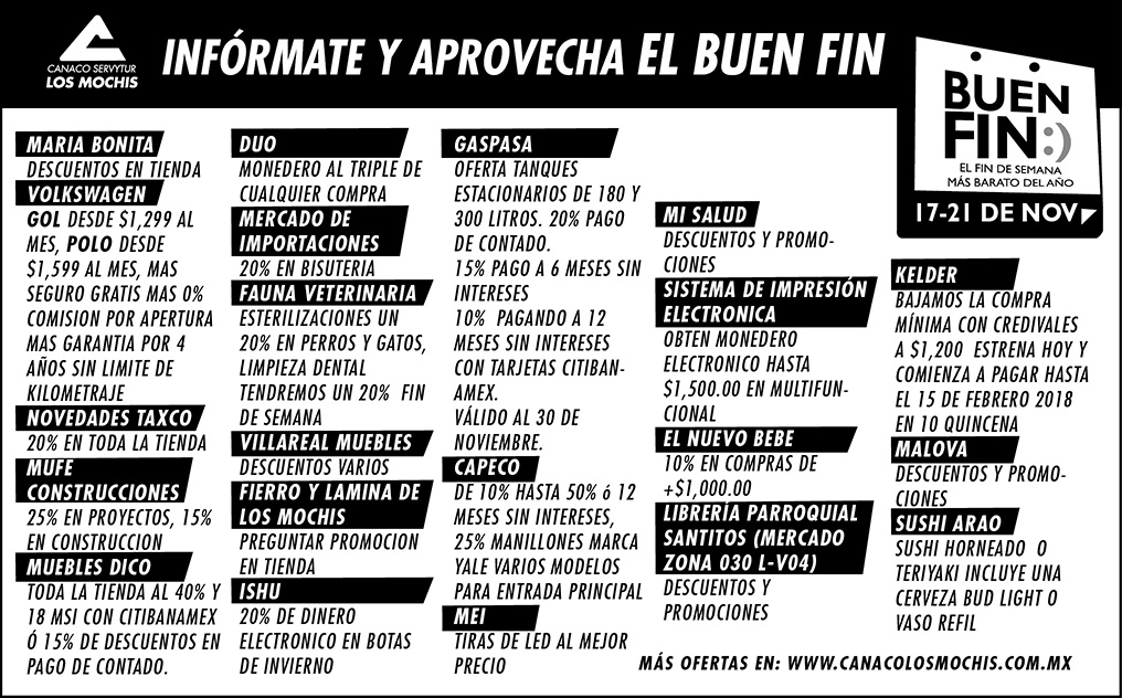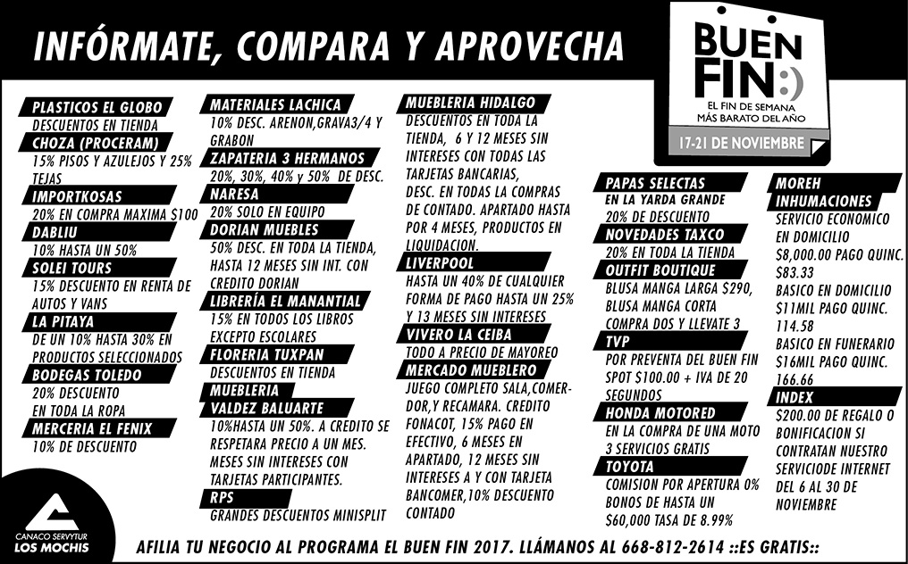 El Buen Fin 2017 es un programa que busca incentivar el consumo y reactivar las ventas. Fueron muchos los comercios de Los Mochis, tanto locales como nacionales, que se afiliaron al programa, y de esta forma ayudar a la economía familiar. A continuación presentamos las ofertas disponibles. Infórmate, compara y aprovecha El Buen Fin.